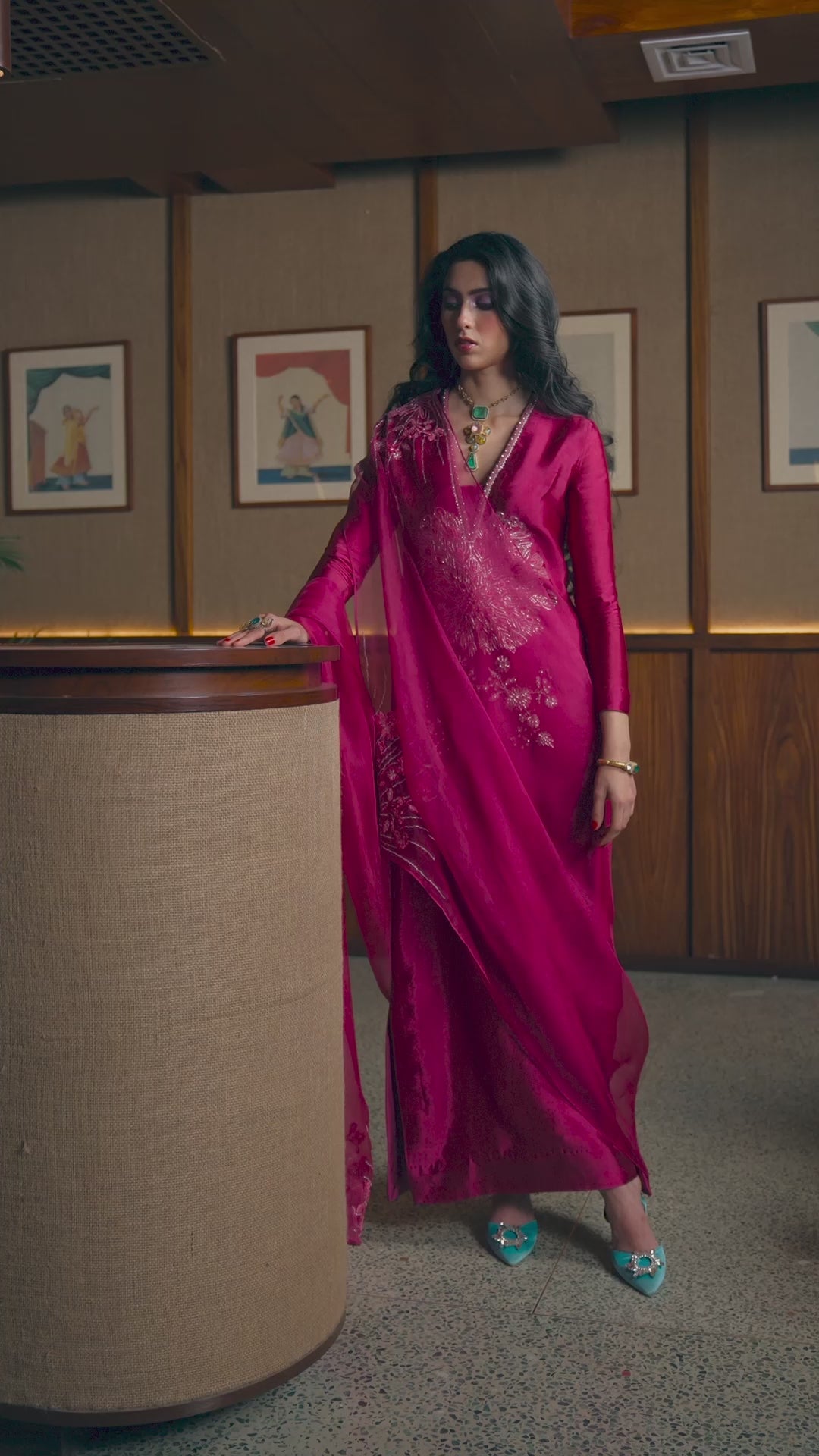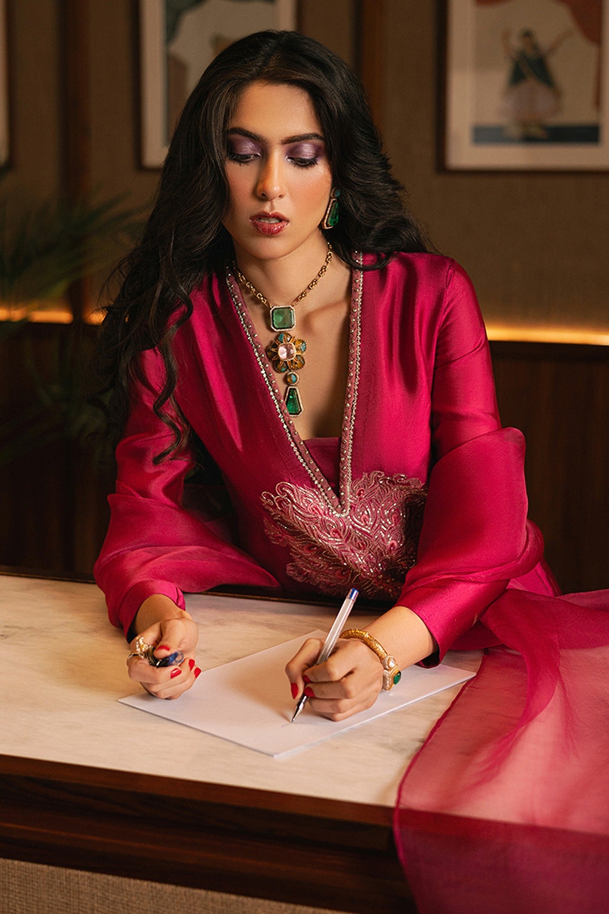 Florescence – A Celebration of Floral Elegance. Radiate timeless charm in Florescence, a stunning V-neck kaftan dress that exudes grace and sophistication. Crafted with delicate net detailing, the front features intricately embroidered and hand-embellished floral designs brought to life with naqshi, cut daana, pipework, and shimmering crystals. Paired with an organza dupatta adorned with embroidered corners on all four sides, this ensemble combines effortless luxury with meticulous craftsmanship. Florescence is the perfect choice for those who desire elegance and artistry in every stitch.