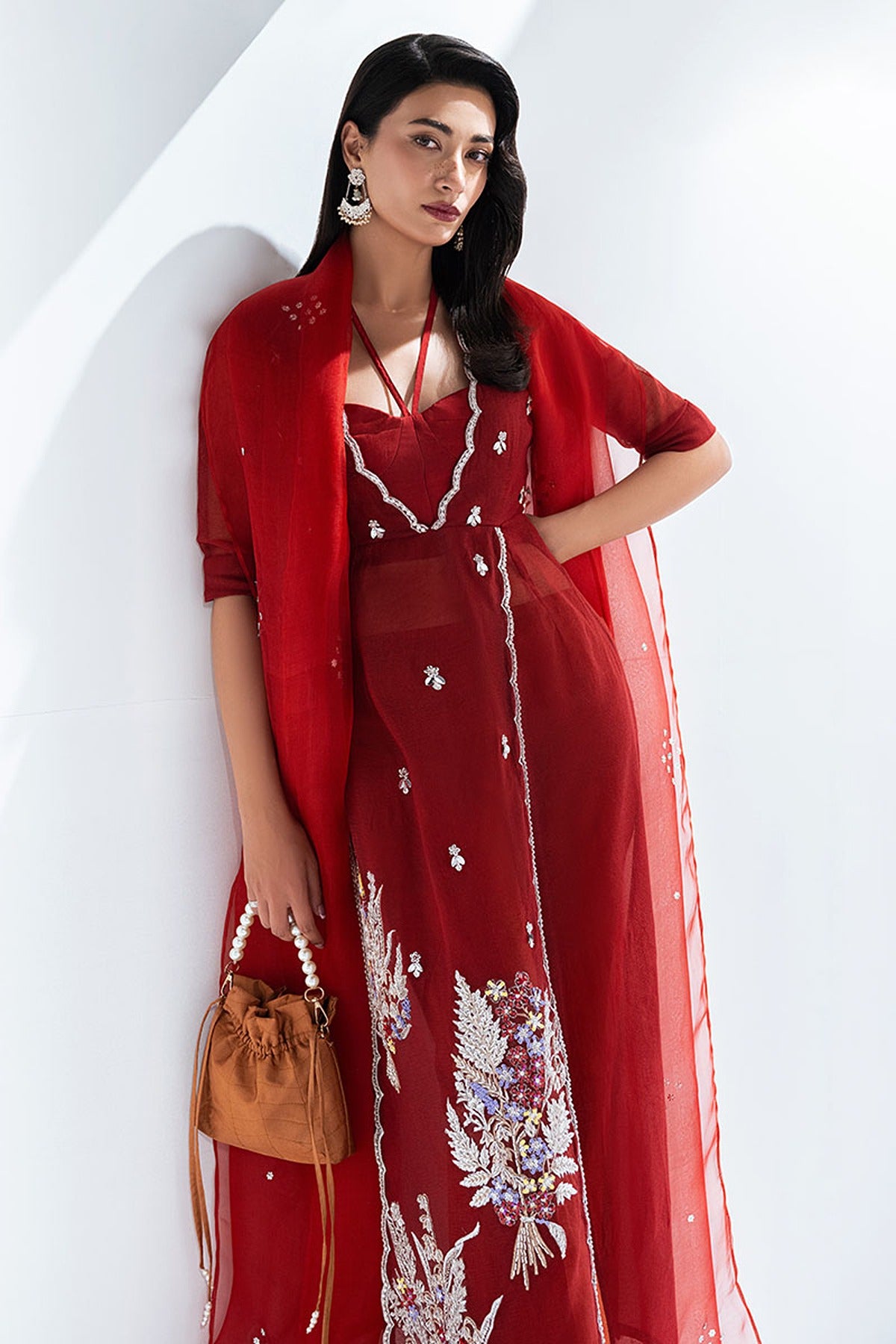 Fabric: Shirt: Cotton Net, Trouser: Thai Silk, Dupatta: Embellished Organza with bag, Bustier and Attached neckline lining