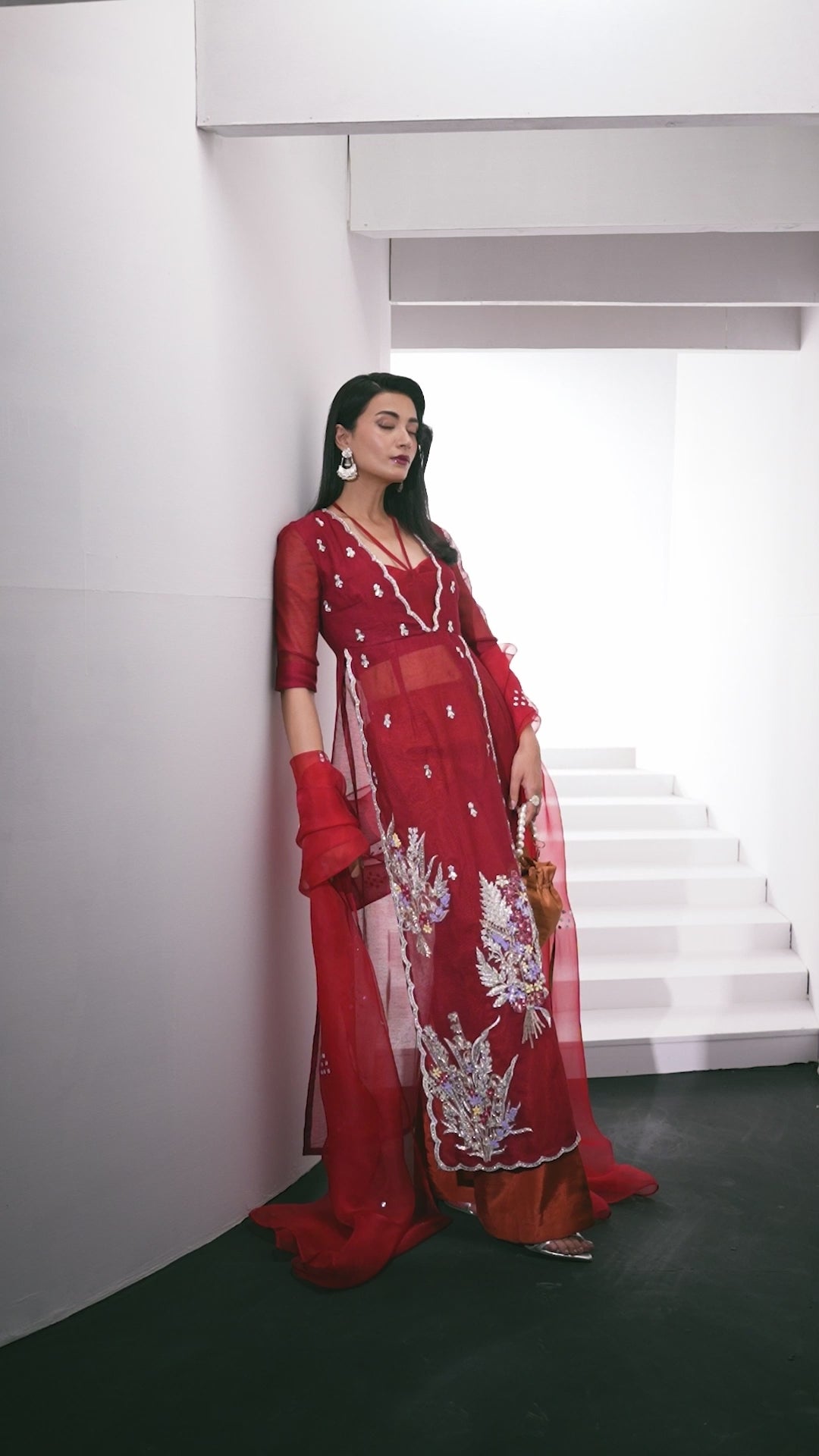 Make an unforgettable entrance in "Flower Bunch". A V-neck panelled dress with scalloped front and side slits, adorned with intricate hand embroidery and paired with a boot cut trouser in luxurious Thai silk. Complete with an embellished organza dupatta, this ensemble epitomizes sophistication and charm in every stitch.