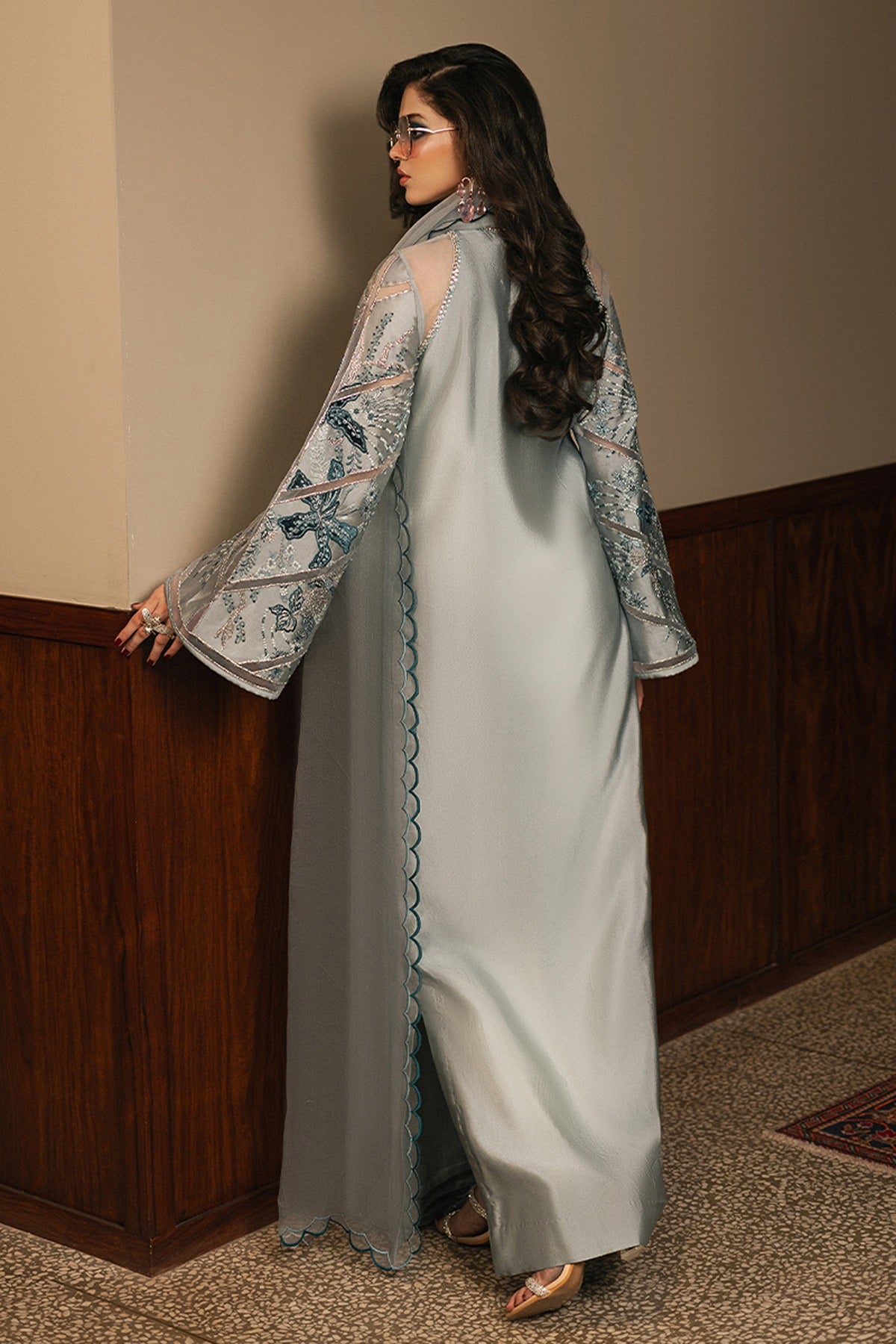 Iceberg, a stunning long kaftan dress featuring sleek side slits for a modern, flowing silhouette. The neckline, both front and back, is exquisitely hand-embellished and elevated with delicate organza patch detailing, exuding timeless refinement. The sleeves are a masterpiece of artistry, adorned with embroidered floral bunches seamlessly blended with velvet and organza patchwork. Completing the look is an organza dupatta, beautifully enhanced with a two-tone scalloped border that adds a touch of ethereal charm. Iceberg is where luxurious craftsmanship meets effortless allure, making it the perfect statement for any grand occasion.