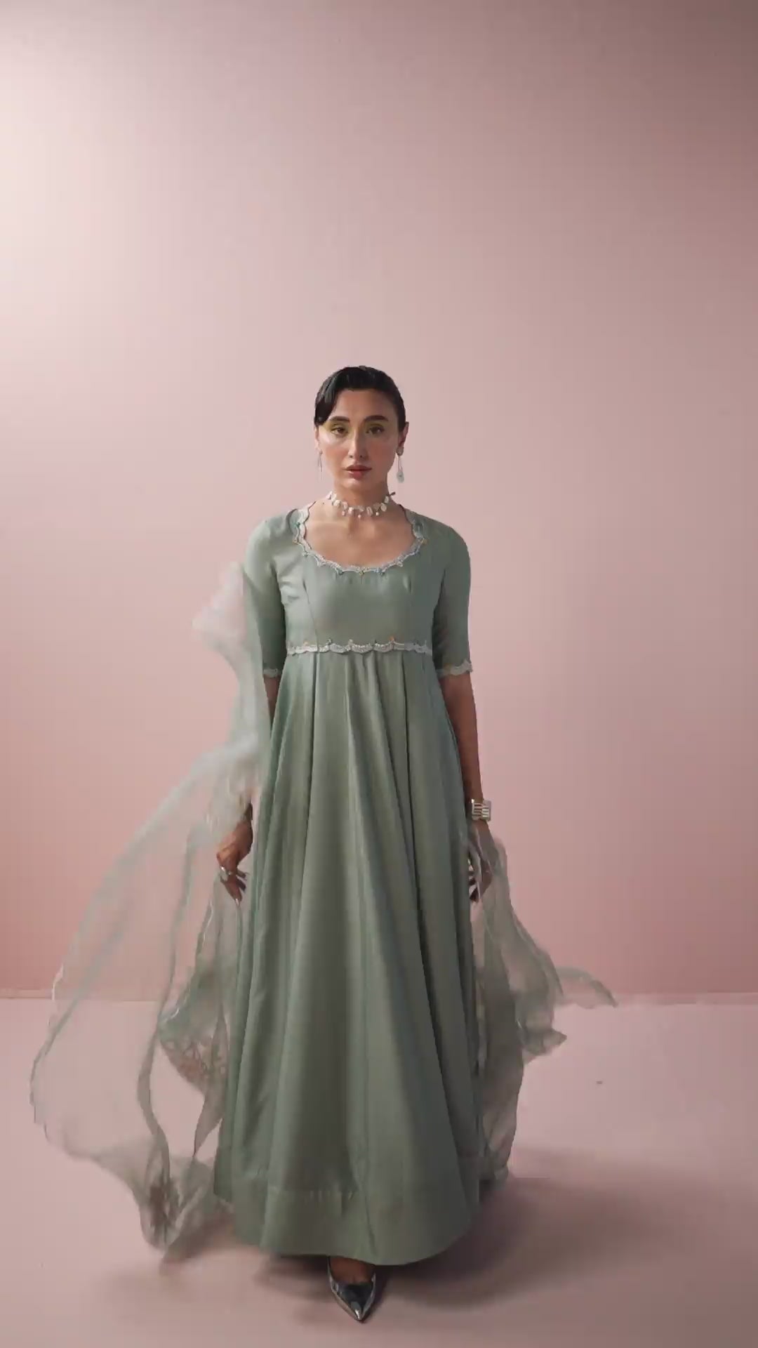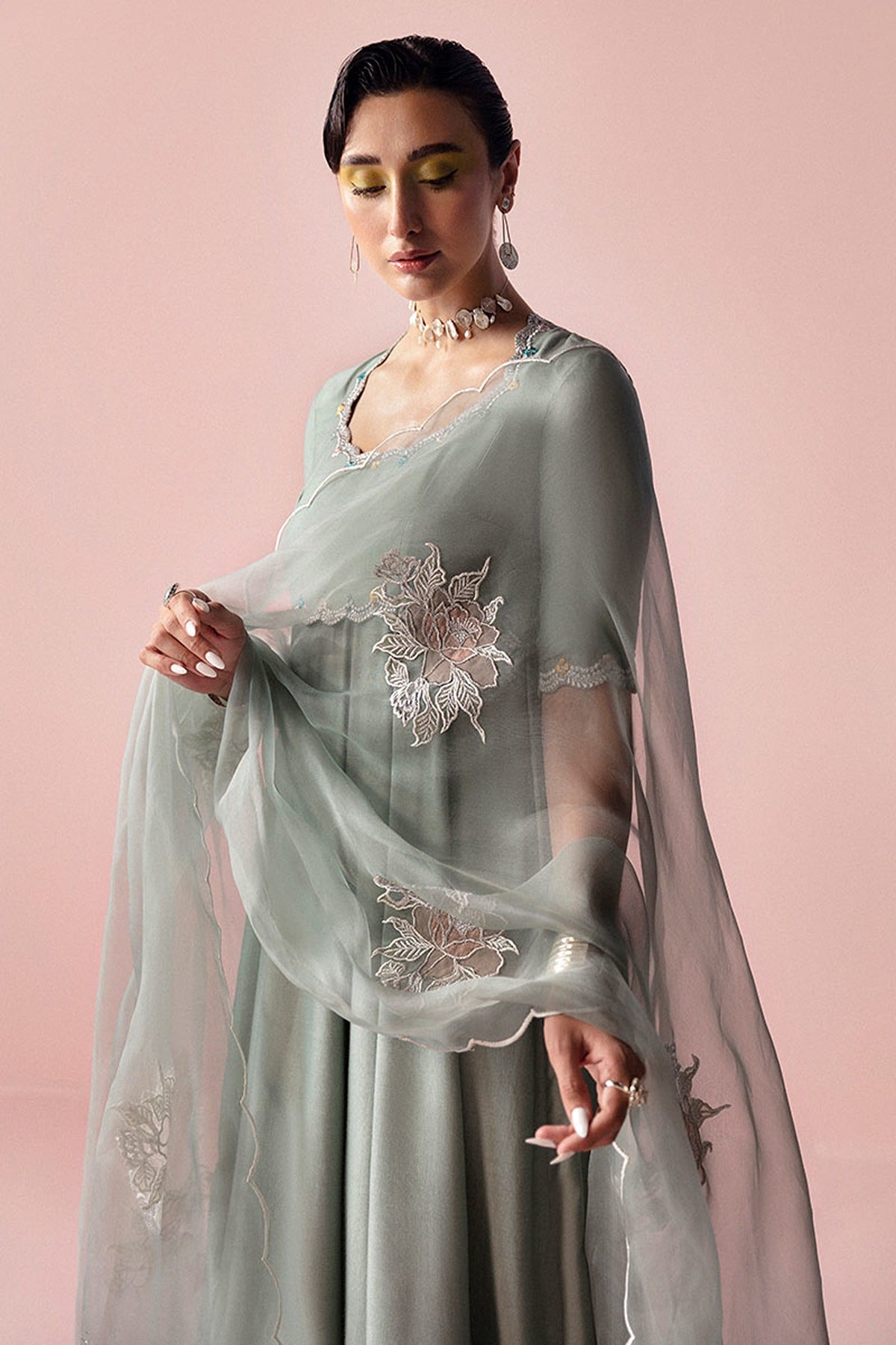 An absolute elegant ensemble in a captivating dull sage green. It features a cotton net peshwas with intricate embroidery on the neckline and sleeves, paired with an organza dupatta adorned with exquisite patchwork motifs and scalloped edges.