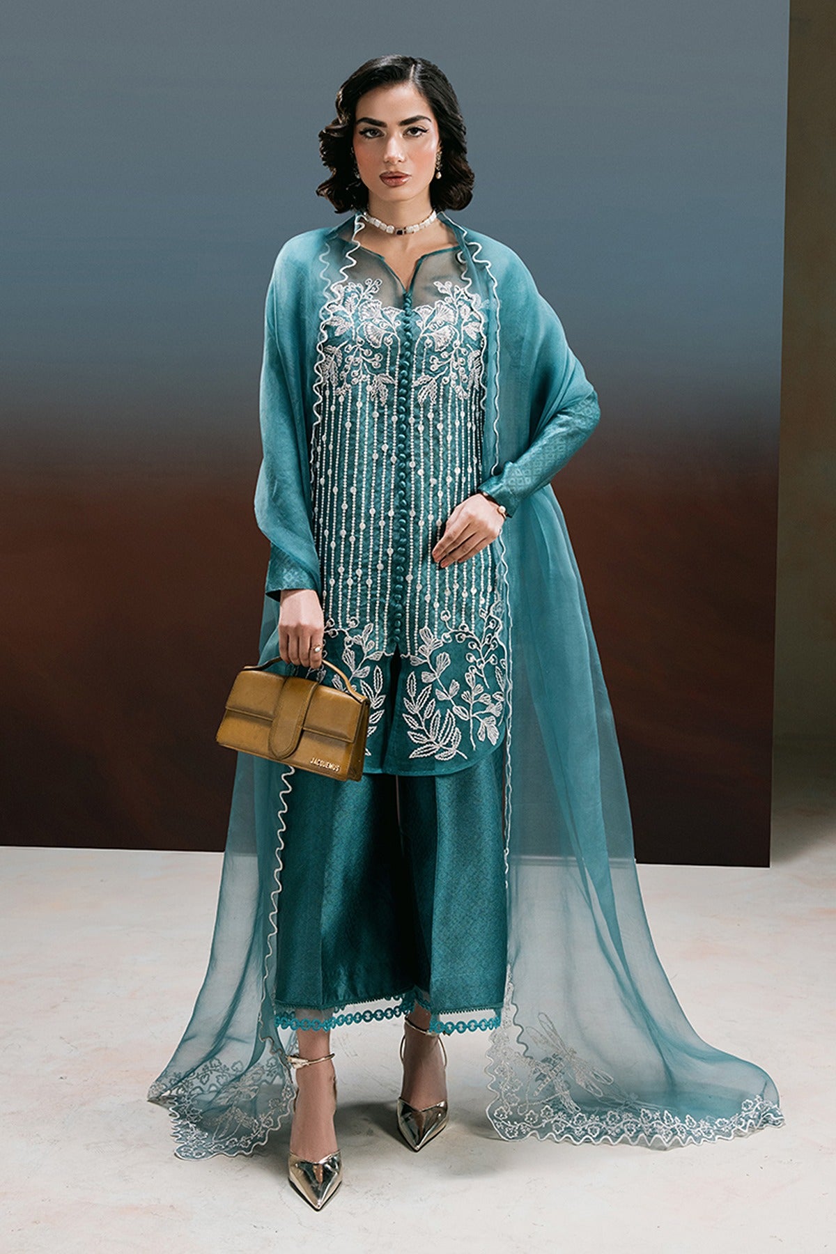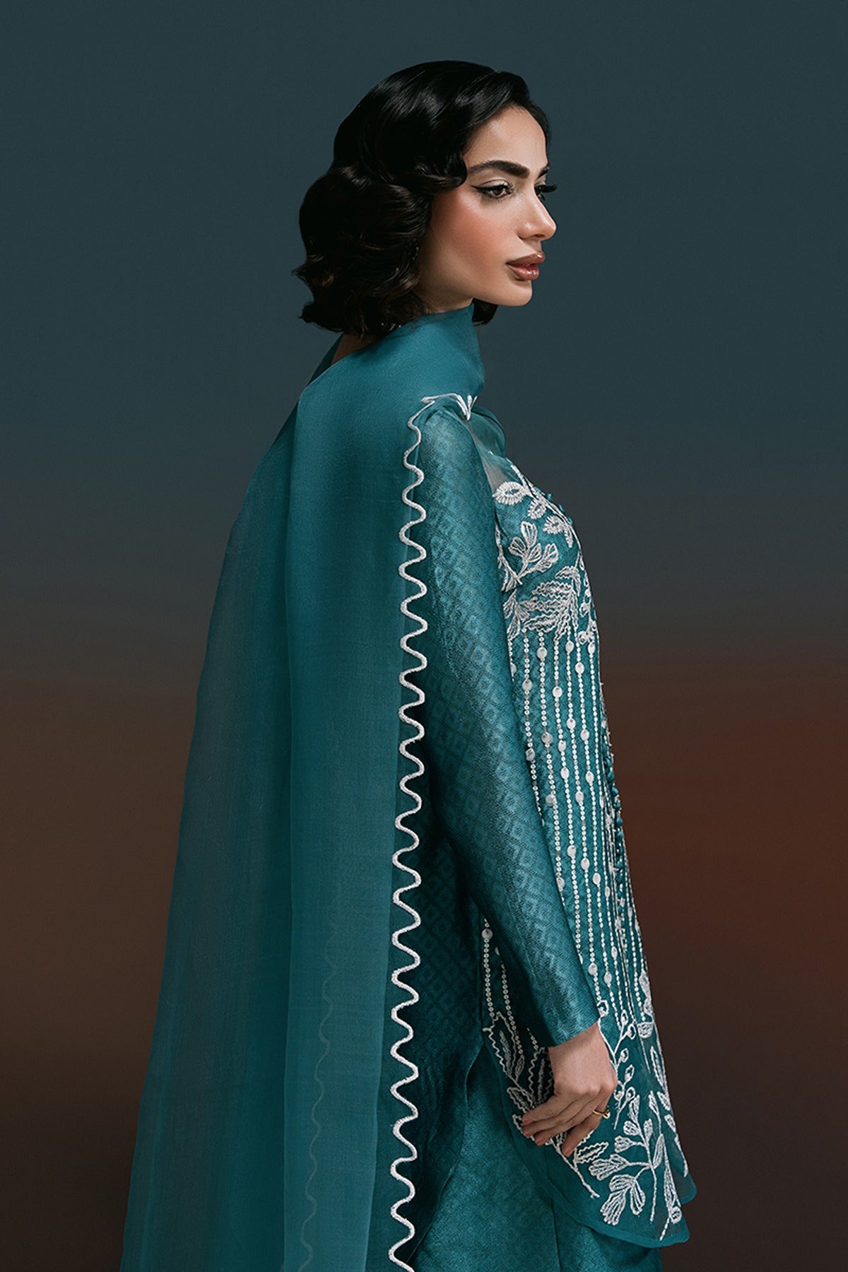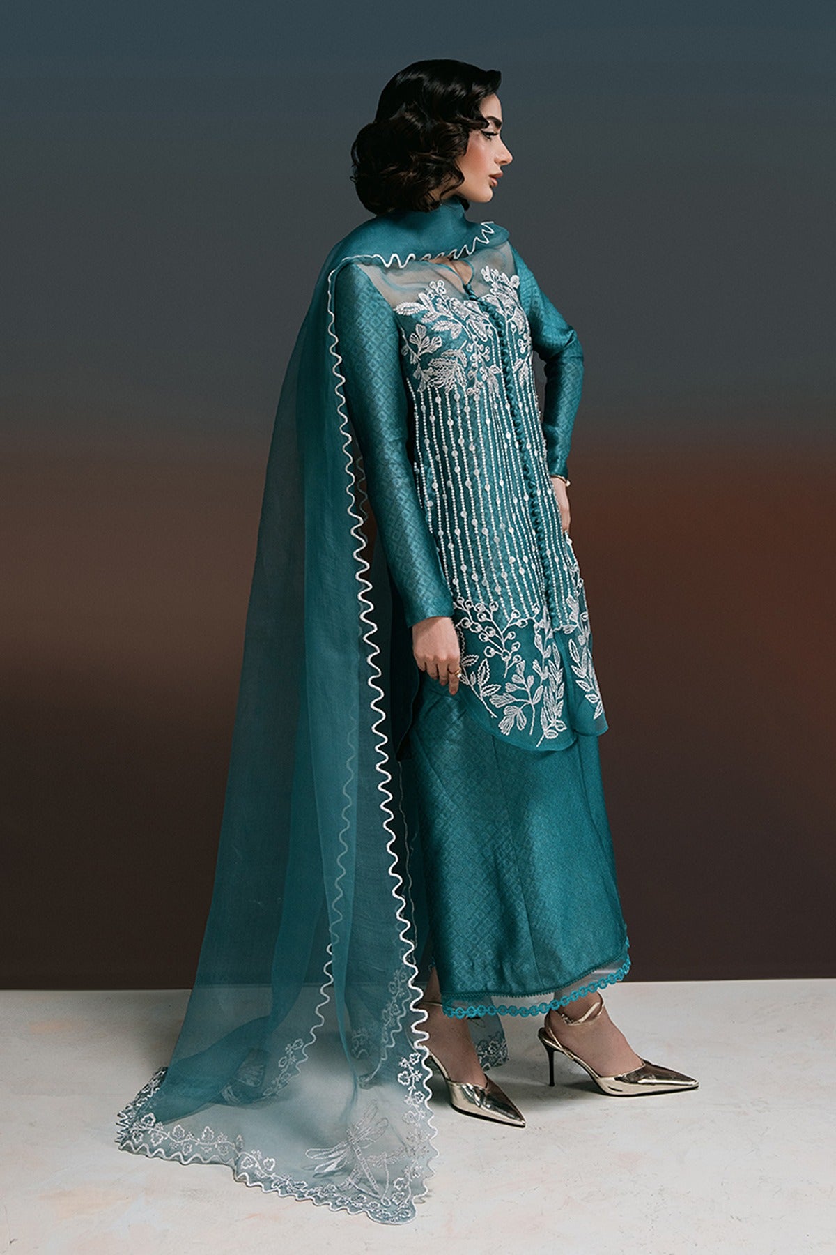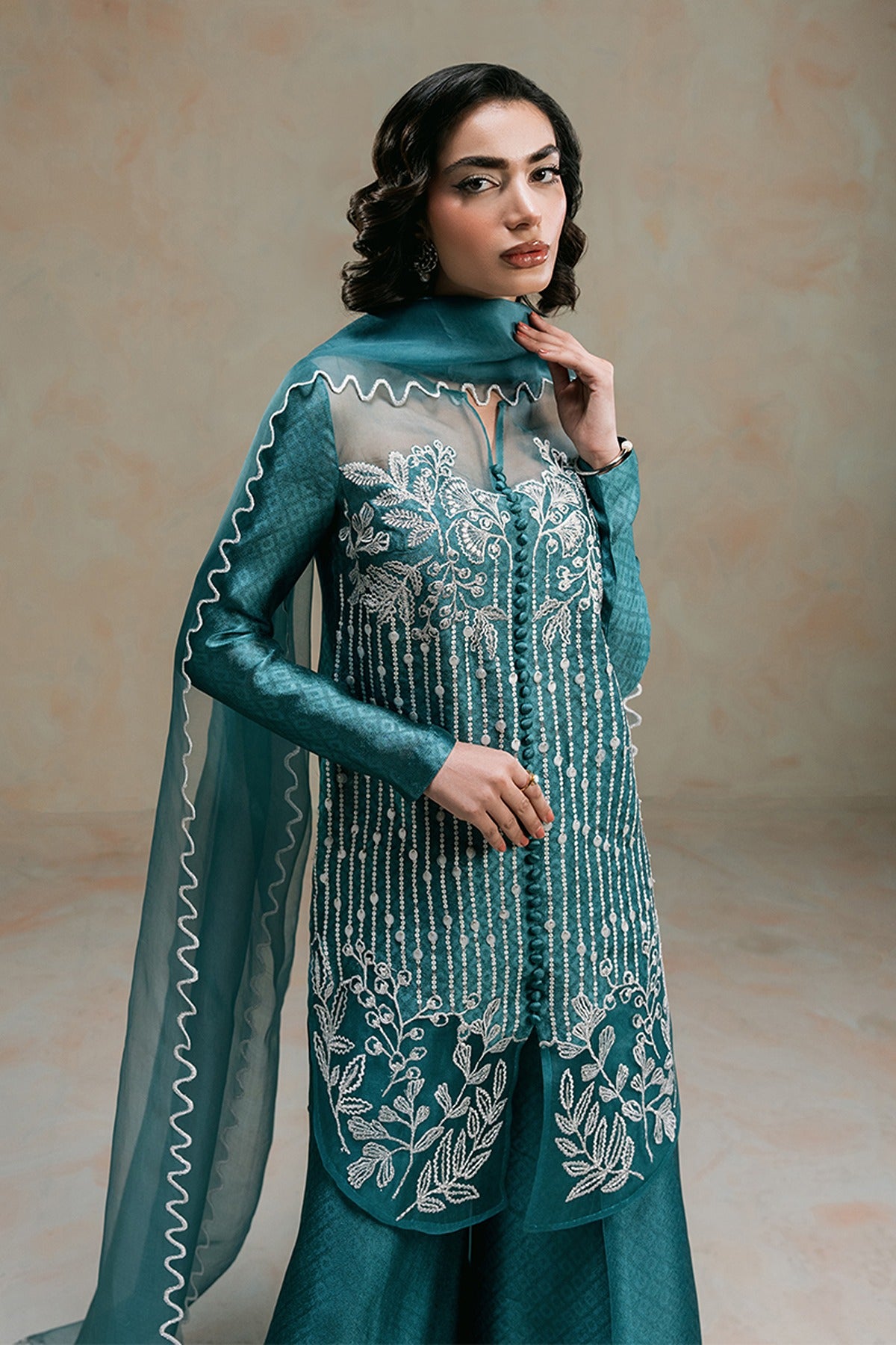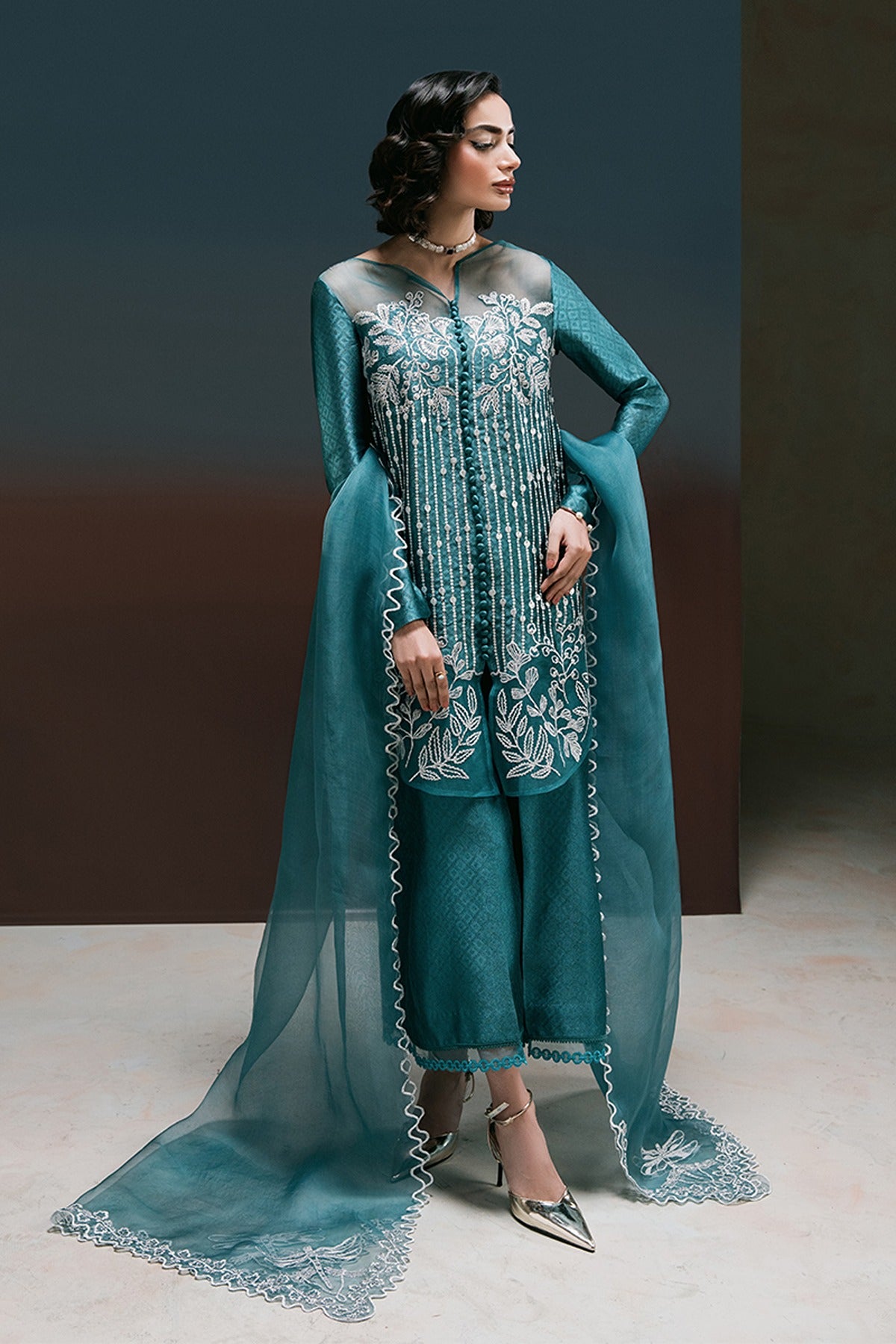 London Bling – A Statement in Elegance. Drenched in a rich teal hue, London Bling is a perfect blend of sophistication and charm. This mid-thigh self-tissue silk shirt is adorned with exquisite embroidered florals and delicate sequin embellishments, creating a mesmerizing play of texture and shine. The patched organza neckline and daman, accentuated with intricate button detailing, add a touch of refinement. Paired with elegantly embroidered culottes, featuring a scalloped organza border with lace accents, and a graceful organza dupatta with scalloped embroidery and corner detailing, this ensemble is a celebration of artistry and timeless fashion.