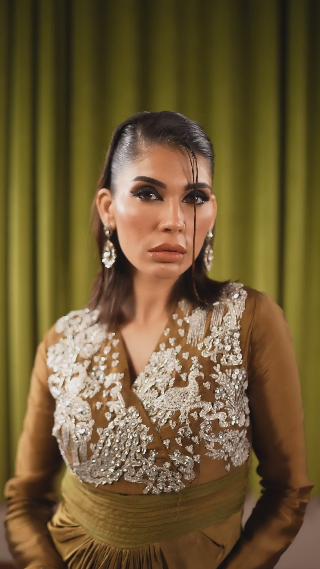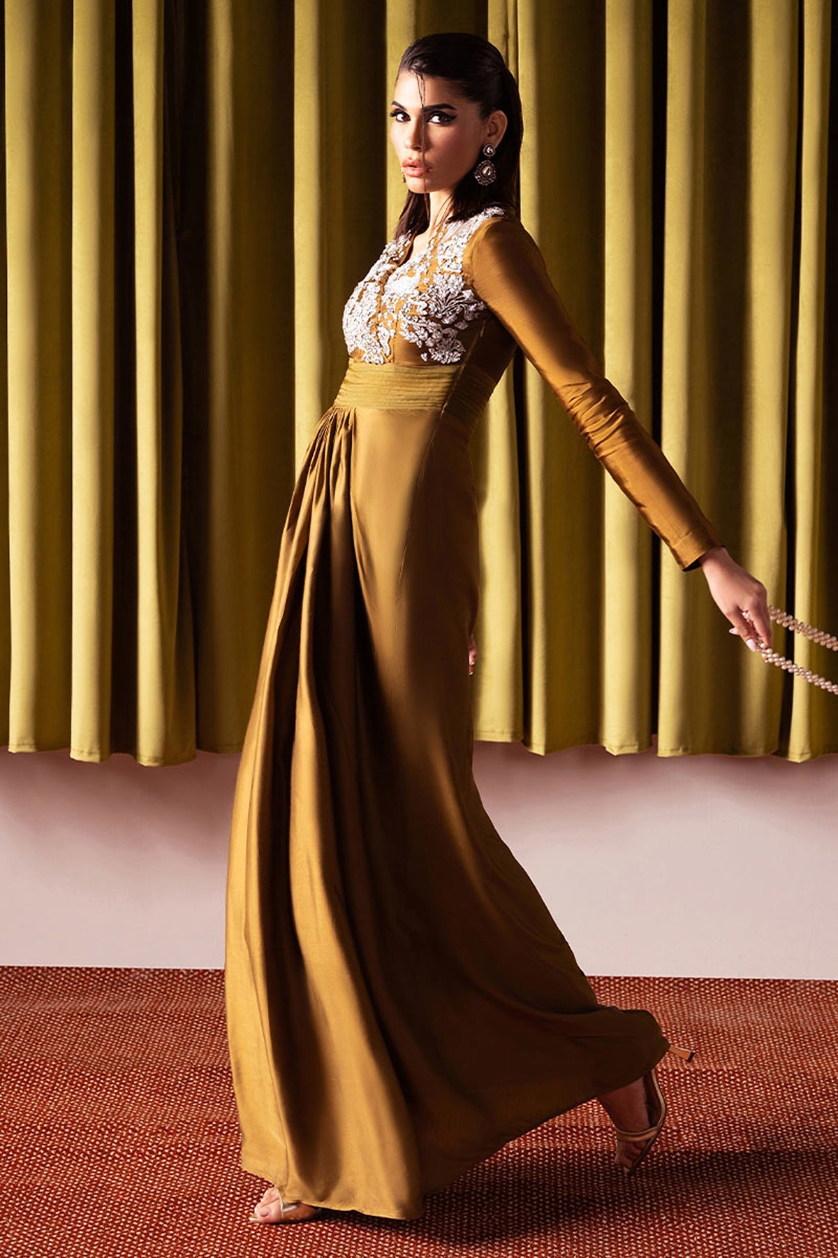Experience the epitome of glamour with "Mademoiselle". Enveloped in the subtle allure of Dull Mustard, this ensemble, crafted from luxurious Tissue Silk and Silk, is a testament to refined sophistication. With its exquisitely embellished bodice, complemented by a pleated organza belt and a gracefully draped lower part, every detail exudes opulence. Paired with an ethereal Organza sequins spray dupatta and an embellished Bag, revel in the essence of festive charm and timeless beauty.