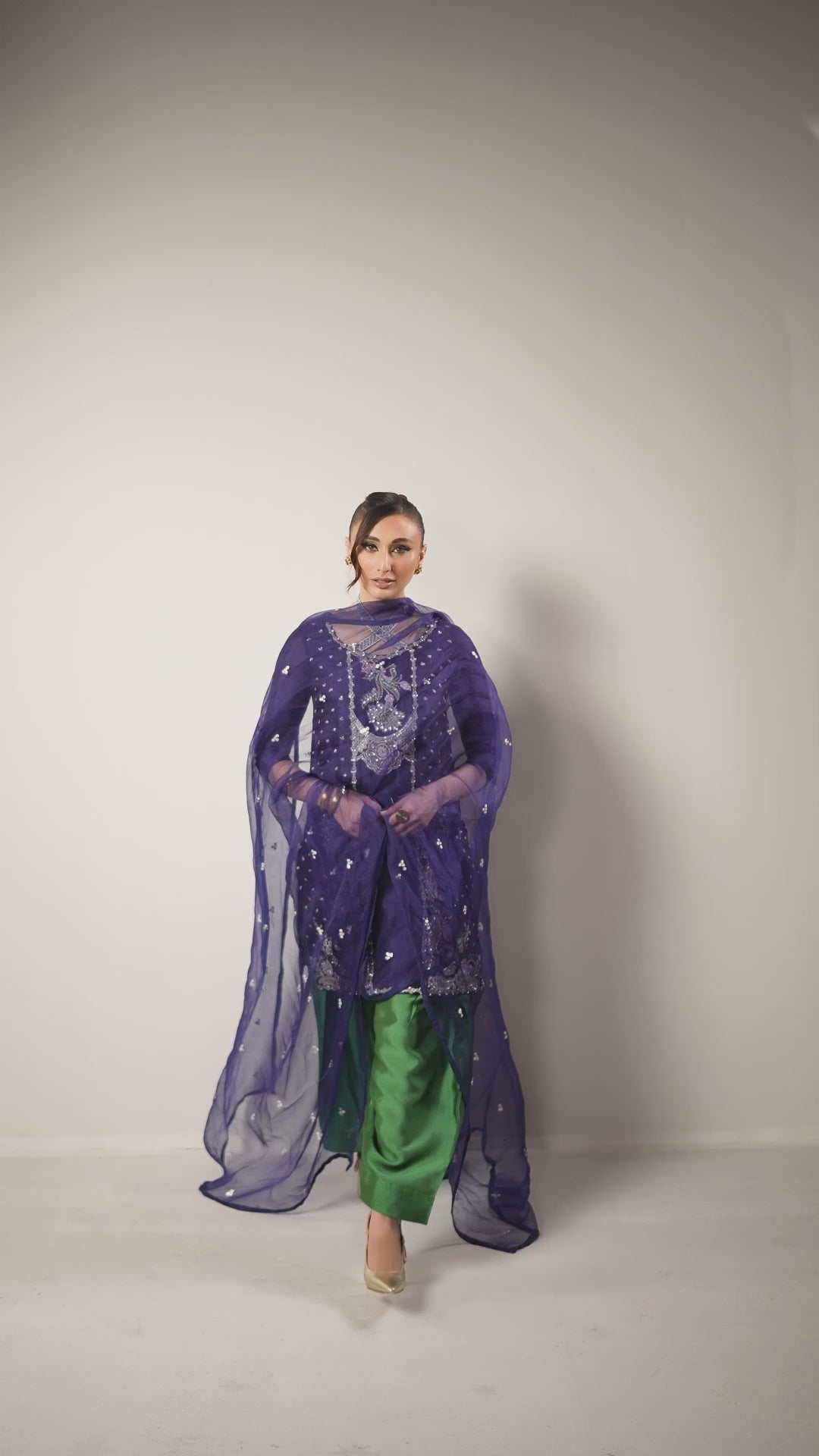 "Manto": a regal ensemble crafted from luxurious tissue silk. Adorned with intricate embellishments, the short shirt features a round neckline and three-quarter fitted sleeves, exuding timeless elegance. Paired with a pleated shalwar in rich green and complemented by an organza heavy sequins spray dupatta, "Manto" embodies sophistication and grace, making it a true statement.