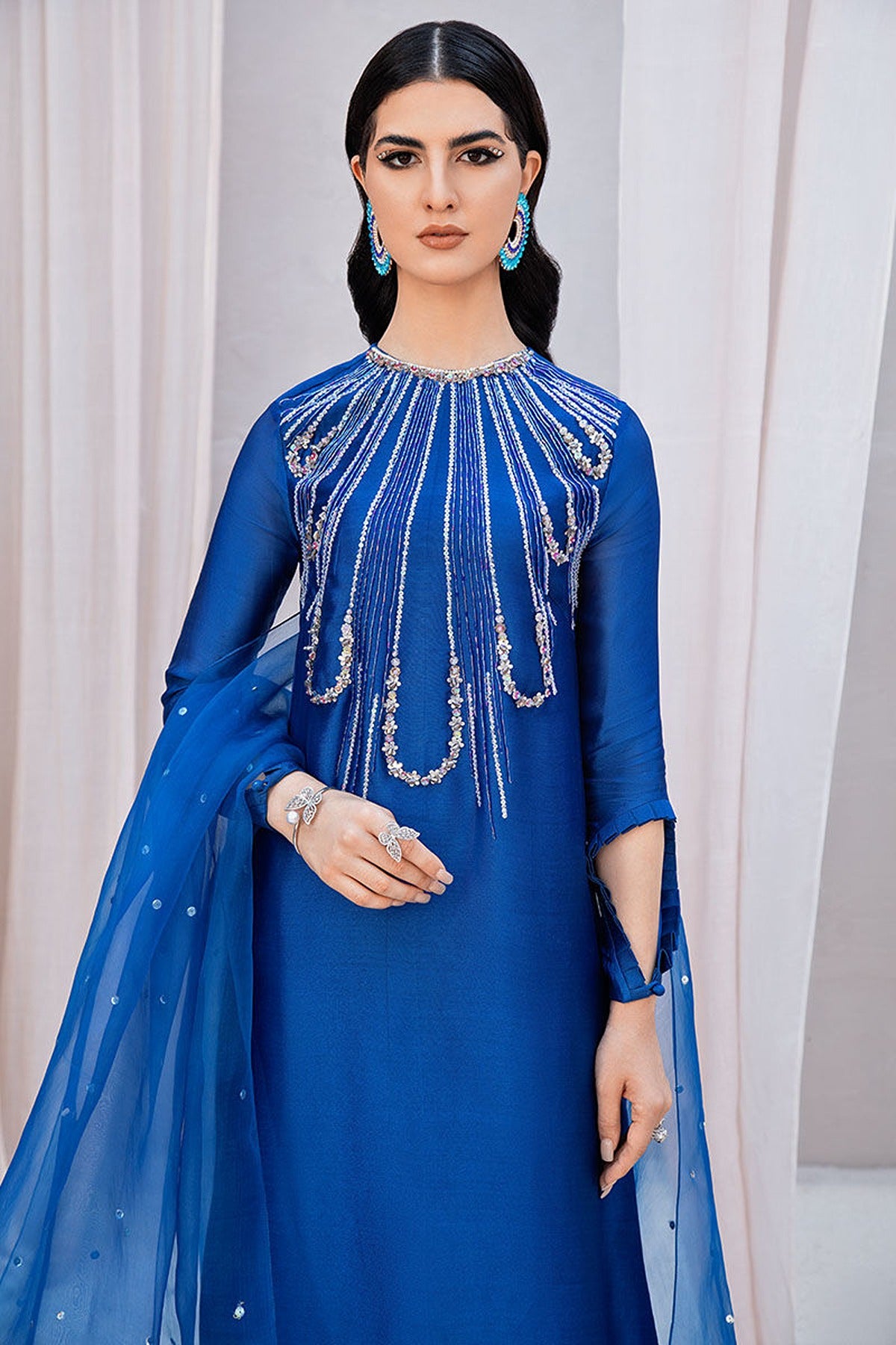 Long Tissue Silk kaftan shirt in royal cobalt blue with finely hand embellished neckline design. Sleeves are fitted with key hole detail and pleated frill stitched. It has short side slits and looks ethereal.
