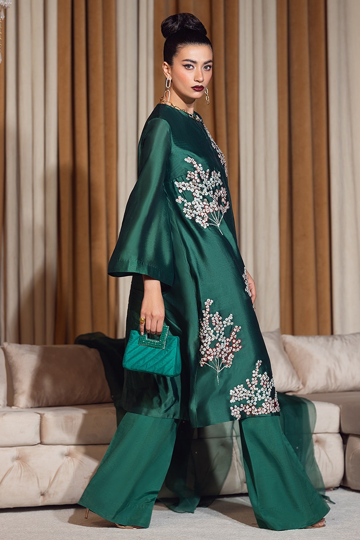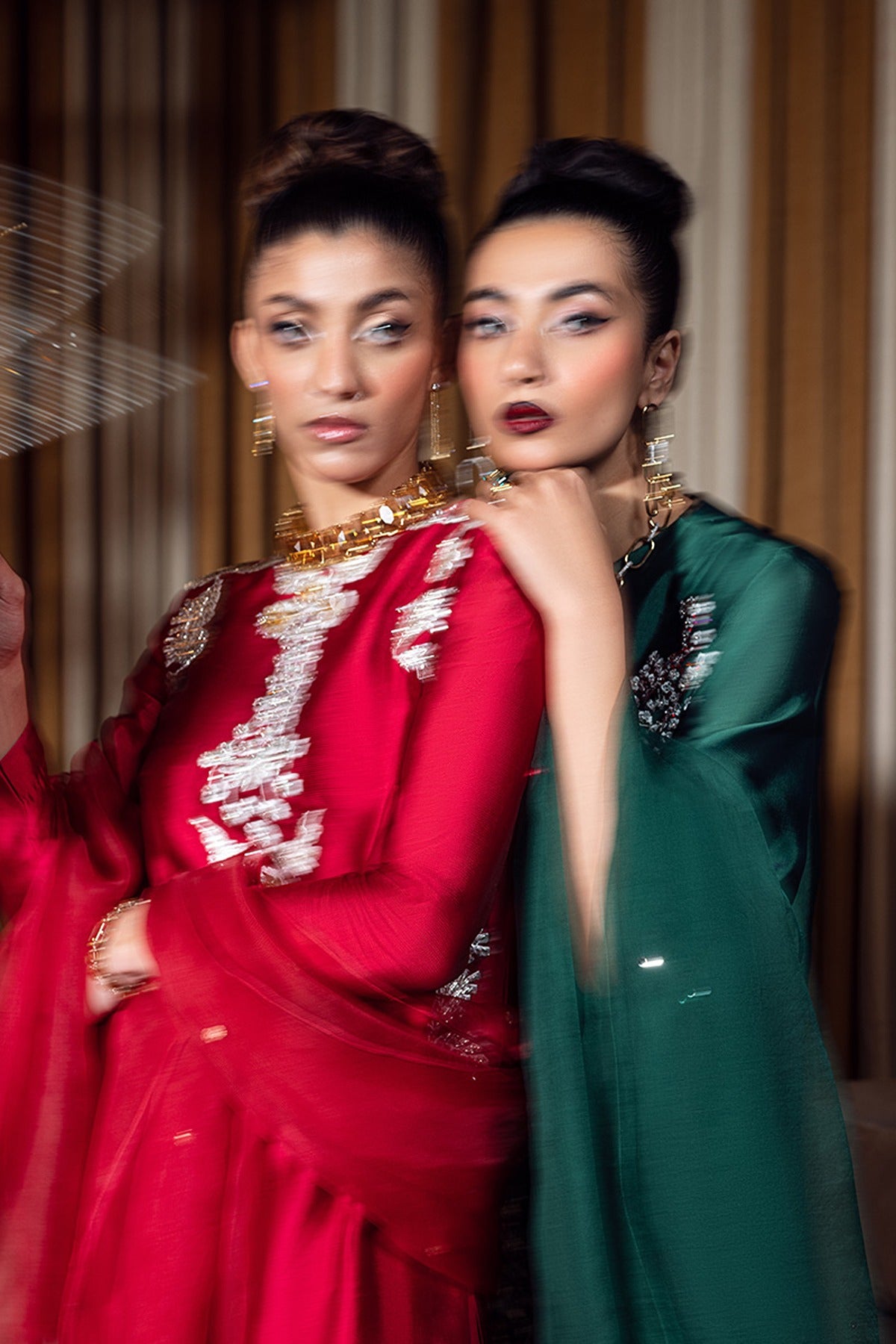 Moon Over Miami features a delightful silhouette, featuring a striking dark green mid length design on a Thai tissue canvas while displaying stunning spade motifs spread across the armhole and neckline. The magical look creates a remarkable statement with flared sleeves and elaborated flowers detailed with red sequins all over the front. Paired with bootcut pants.