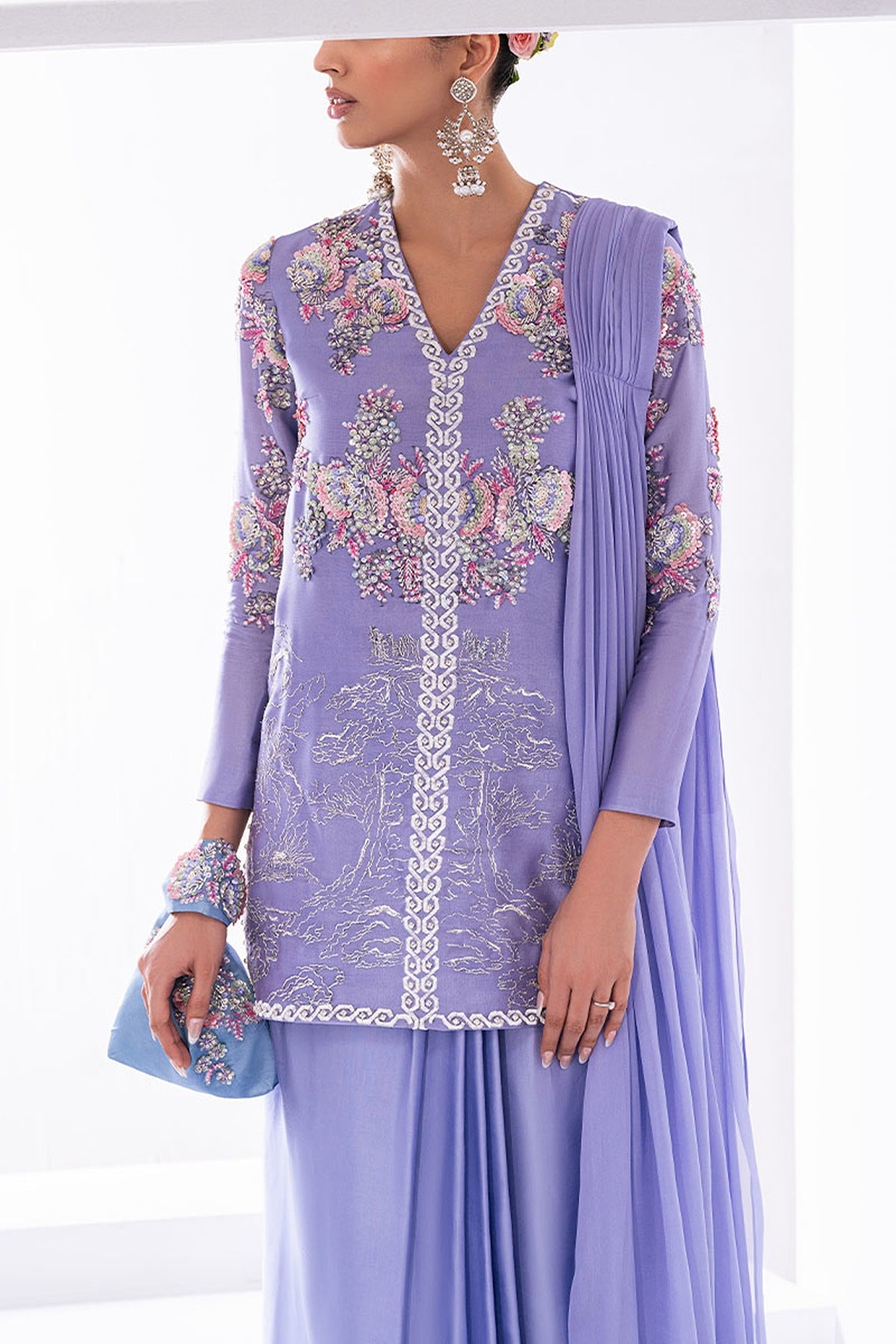 A vision of ethereal beauty. Pairing a short shirt with a pleated silk skirt and chiffon dupatta for a timeless look.