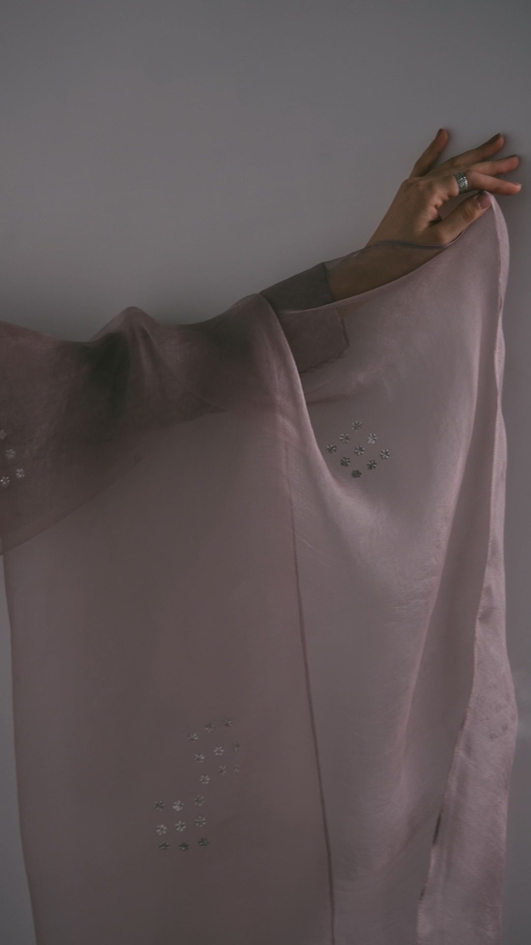 Presenting Spinfluence in Dusty Pink – an epitome of sophistication and grace. This exquisite ensemble is meticulously crafted to adorn you with timeless elegance and undeniable charm. A stunning V-neck dress with a waist-high slit, adorned with a crisscross organza border and intricate button detailing. Hand-embroidered motifs add exquisite charm. Paired with boot-cut trousers in luxurious Thai Silk and an embellished organza dupatta.